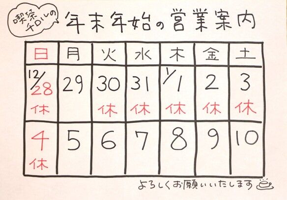~年末年始の営業案内~ いきなり冬が来て、気がついたら年末でとカレンダーに気持ちが追いつかない日々ですが、年末年始は少し長めにお休みをいただきます。 よろしくお願いいたします。